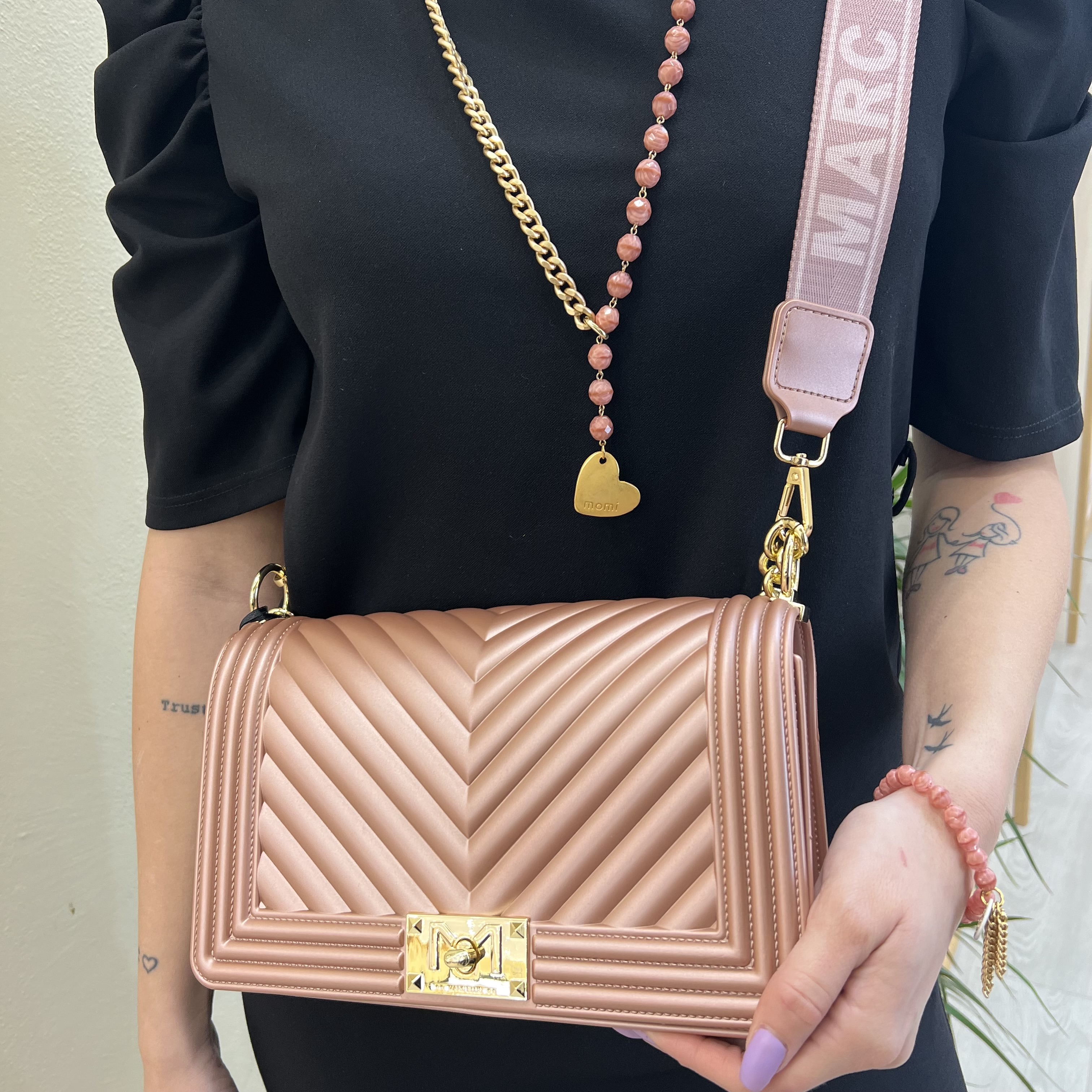 tracolla in catena e in stoffa logata.
